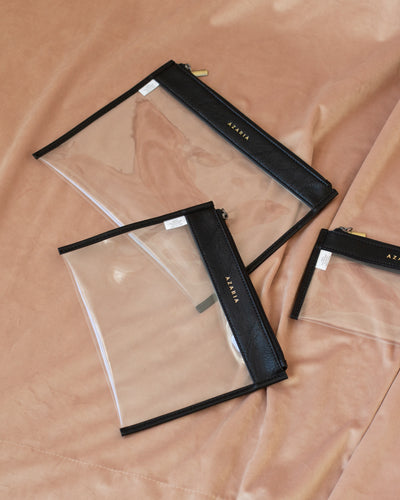 A chic clear organizer pouch that makes it easy to see what you're carrying. Great for storing makeup, school supplies, first aid kits, snacks, money, and keeping things protected from the elements wile traveling.
