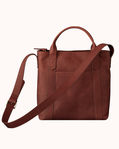 Crafted from vintage cognac full-grain leather and finished with antique gold hardware, the Amelie Tote brings a sense of understated luxury to your daily carry. Its structured silhouette holds its shape while offering thoughtful features designed to simplify your day.