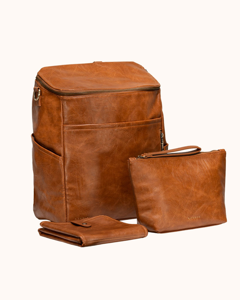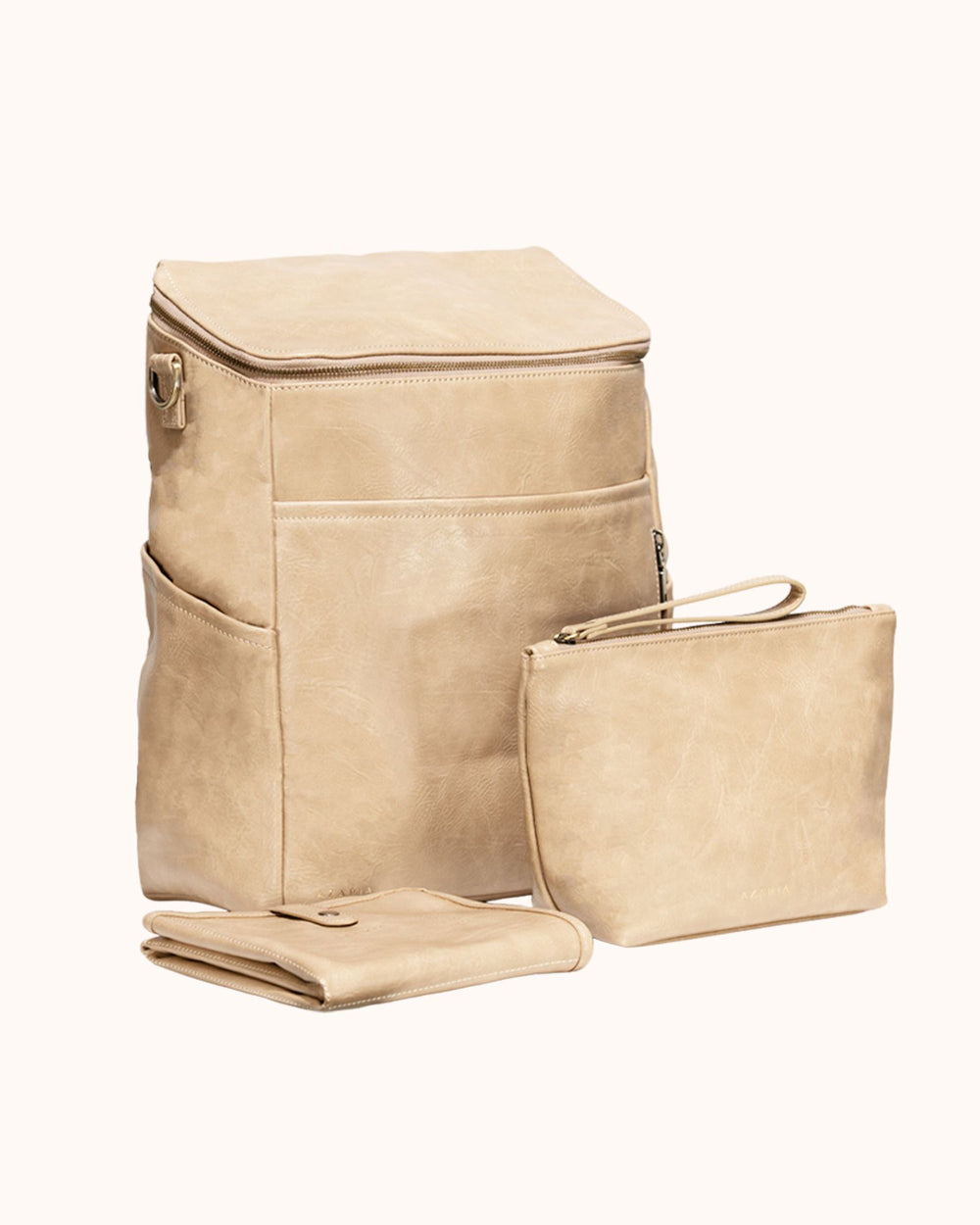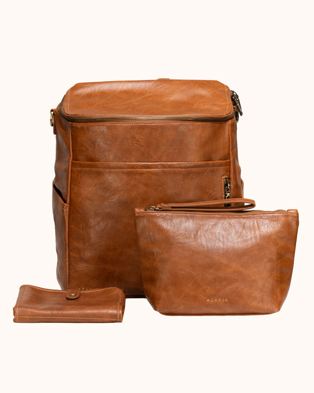 Each piece in the set is crafted from high-quality vegan leather with durable hardware and thoughtful construction, creating a diaper bag system that is both functional and refined.