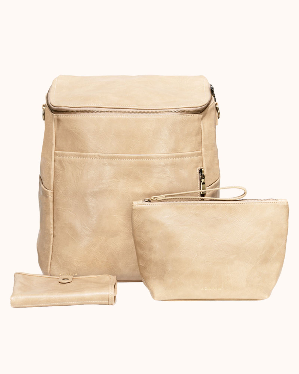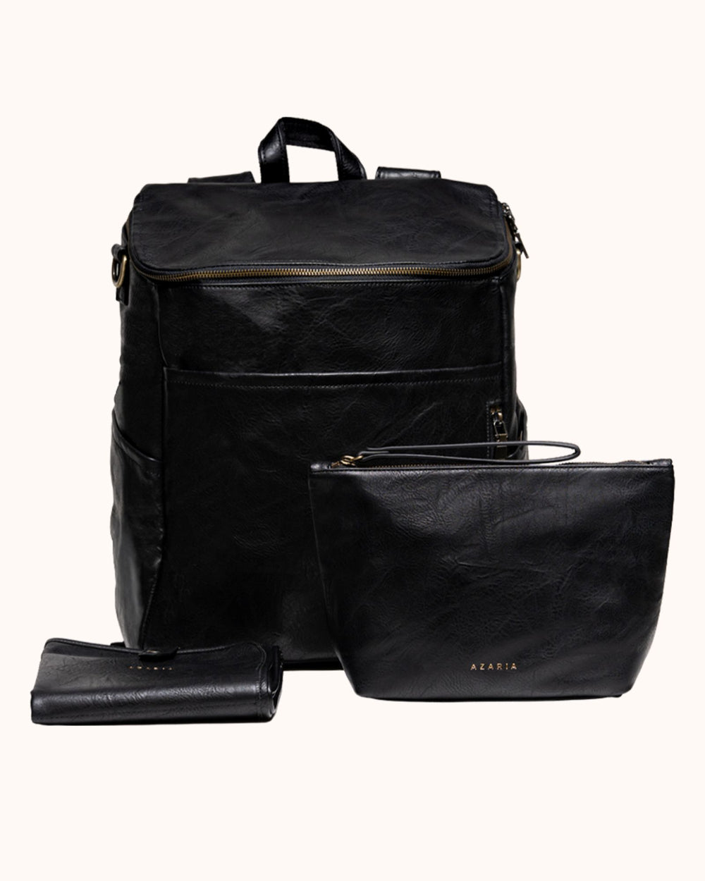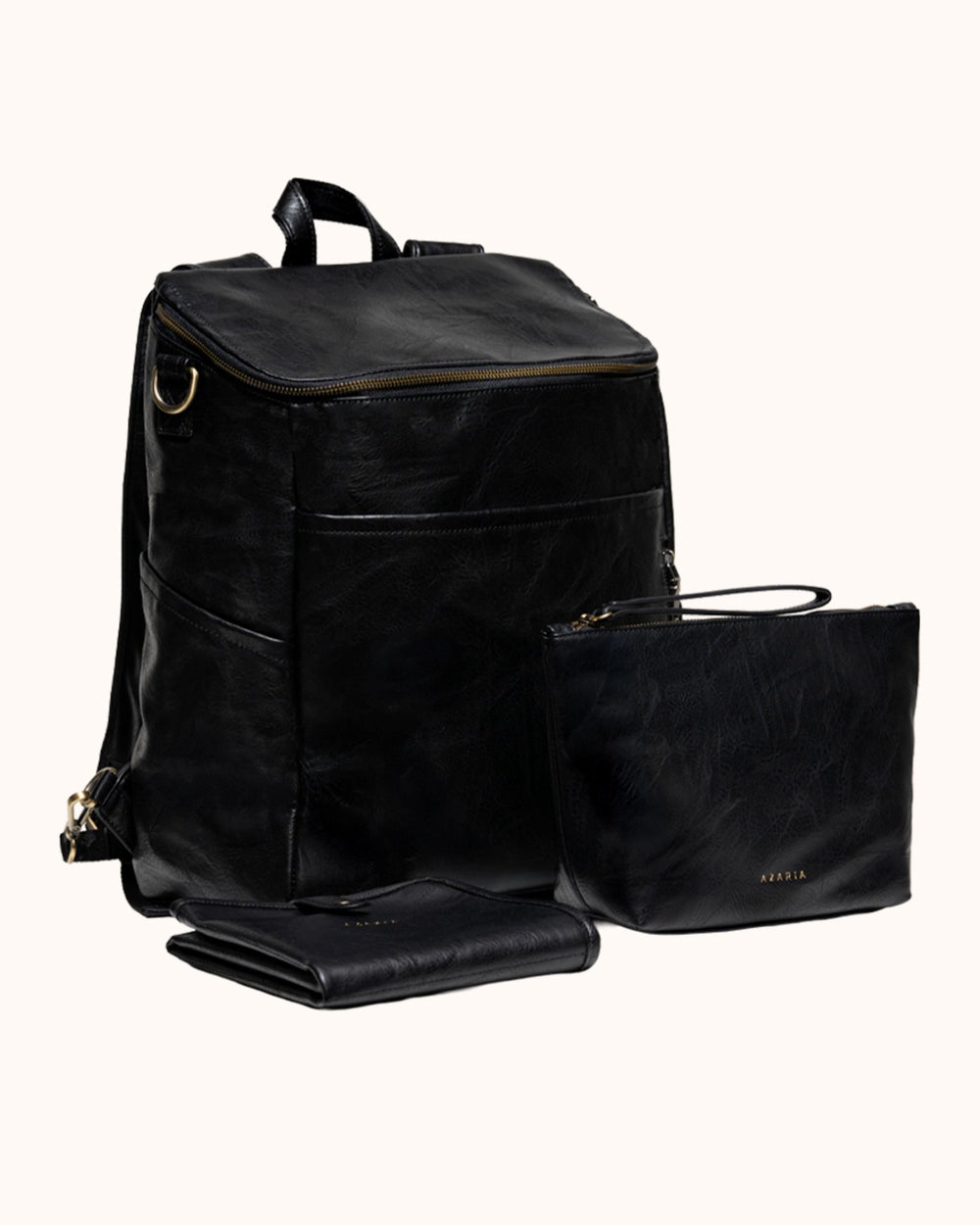 Each piece in the set is crafted from high-quality vegan leather with durable hardware and thoughtful construction, creating a diaper bag system that is both functional and refined.