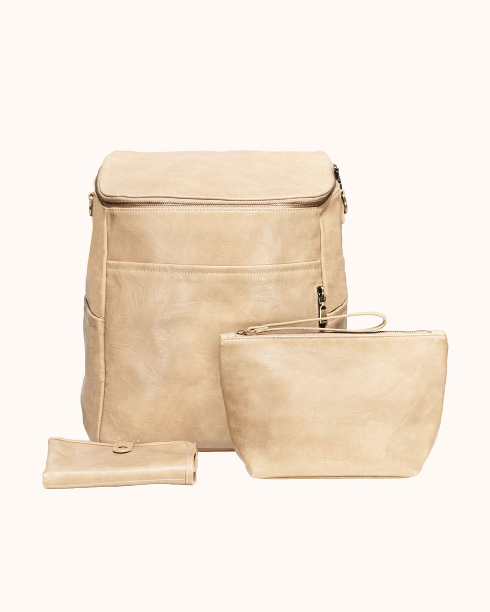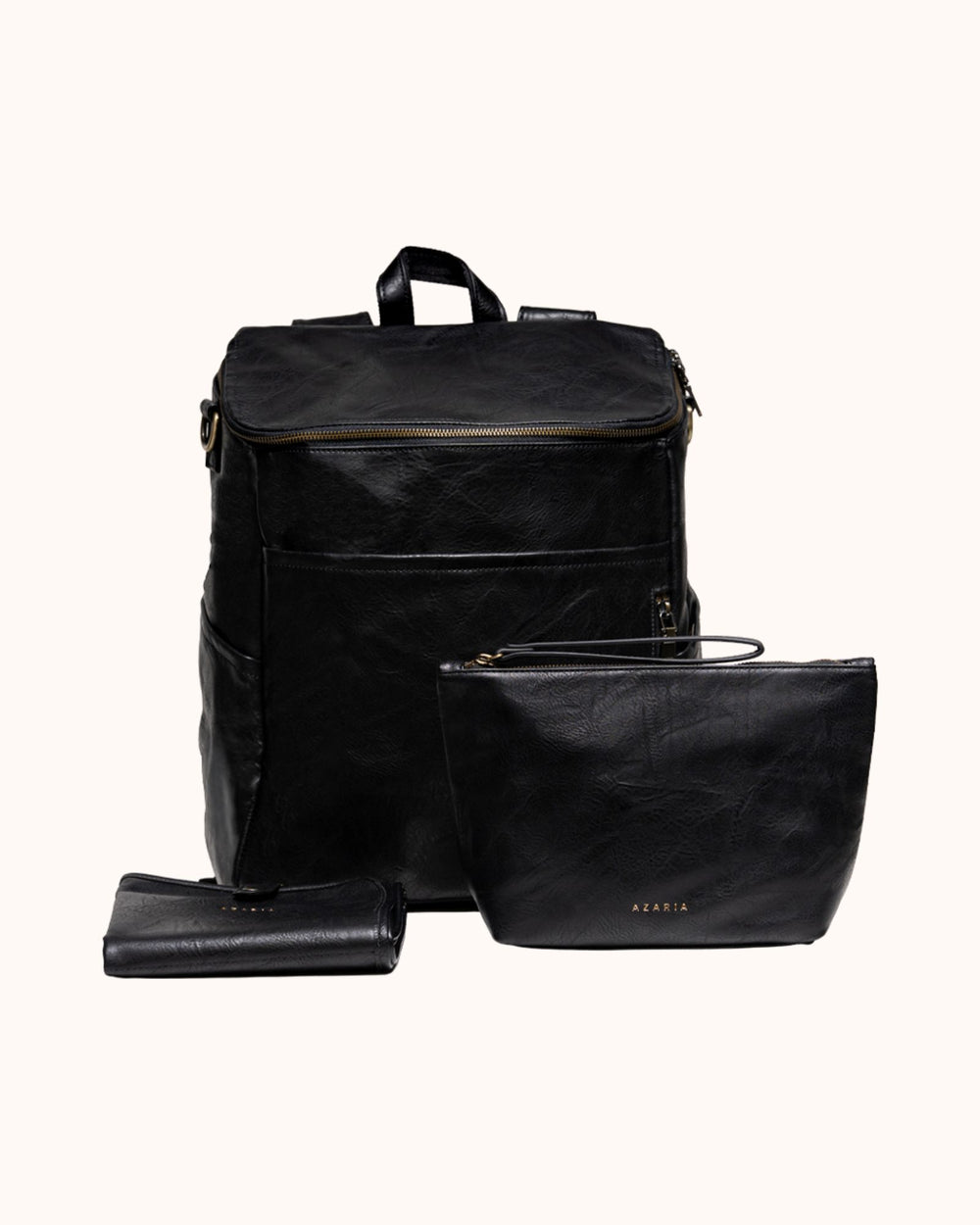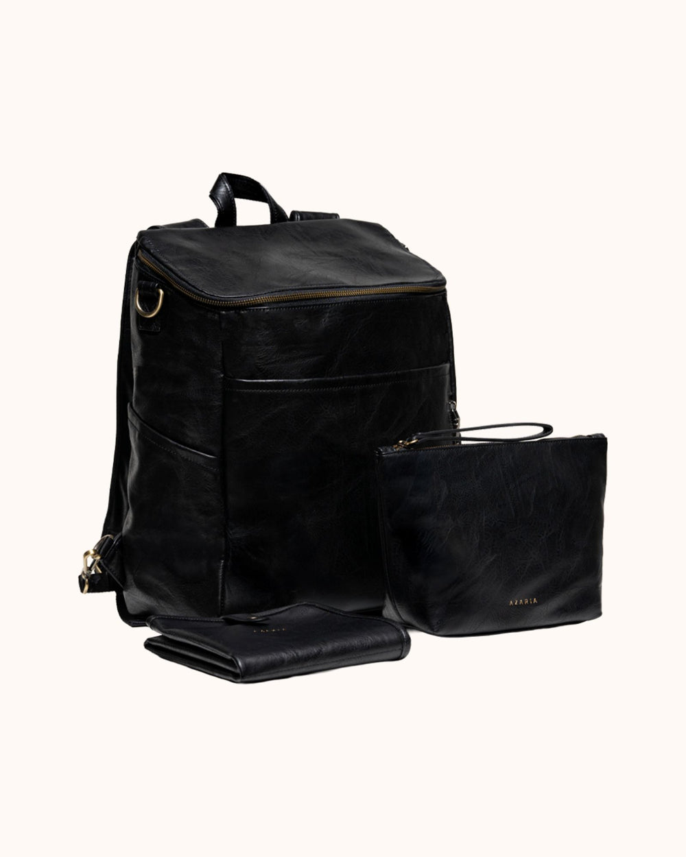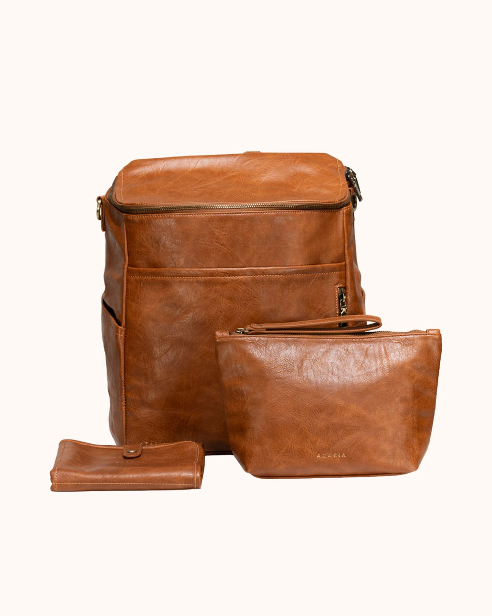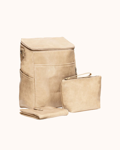 Each piece in the set is crafted from high-quality vegan leather with durable hardware and thoughtful construction, creating a diaper bag system that is both functional and refined.