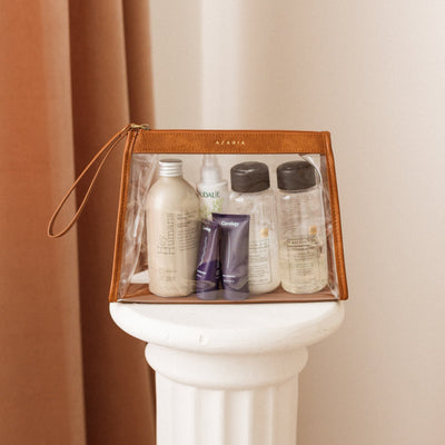 This transparent tote is the ultimate upgrade to that ziplock bag you have been using to store your bottles and lotions. The clear walls make it easy to see the contents to wipe off spills. With a clutch strap and structured bottom for structure, this little bag packs a big punch.